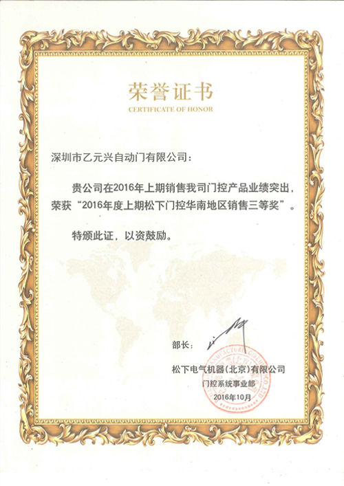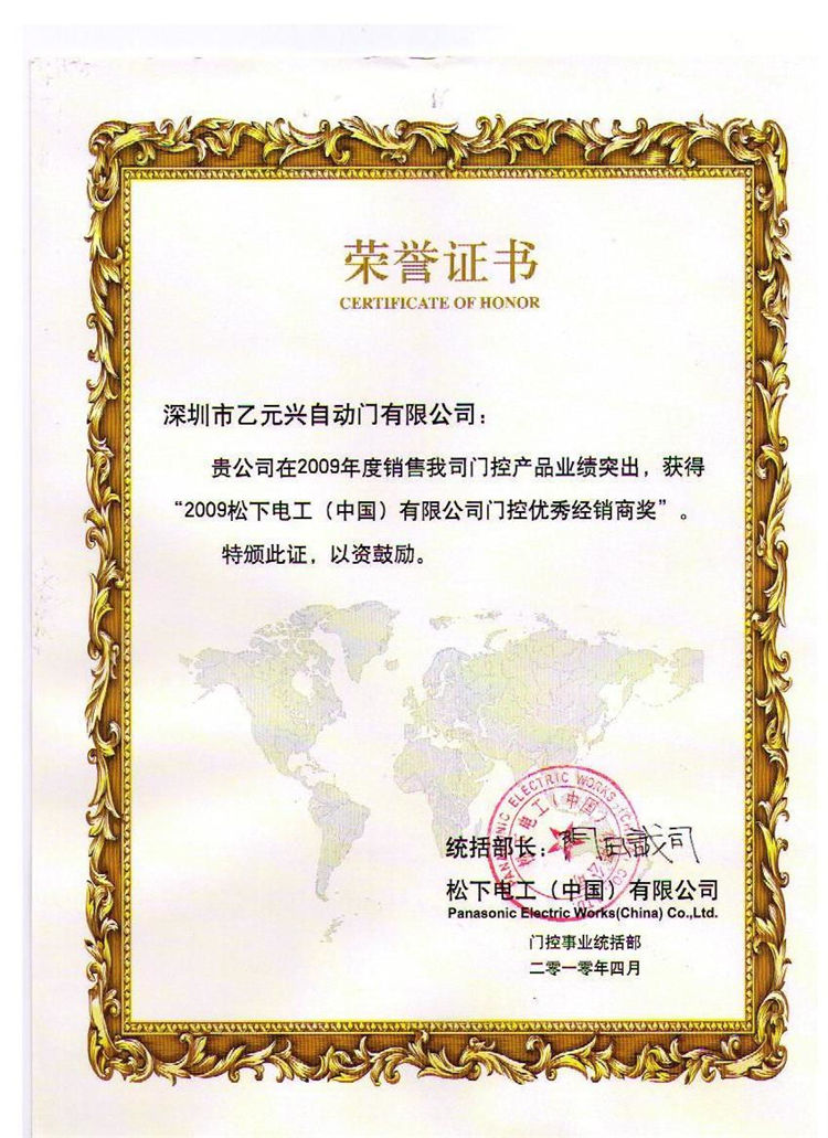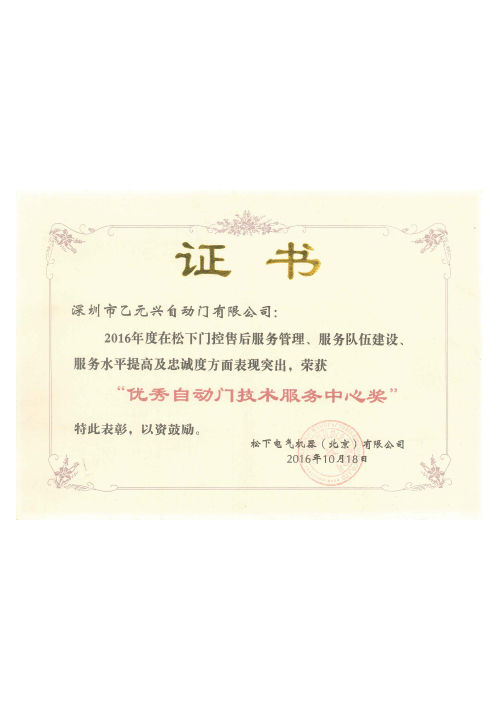 • 松下技术服务优秀荣誉证书